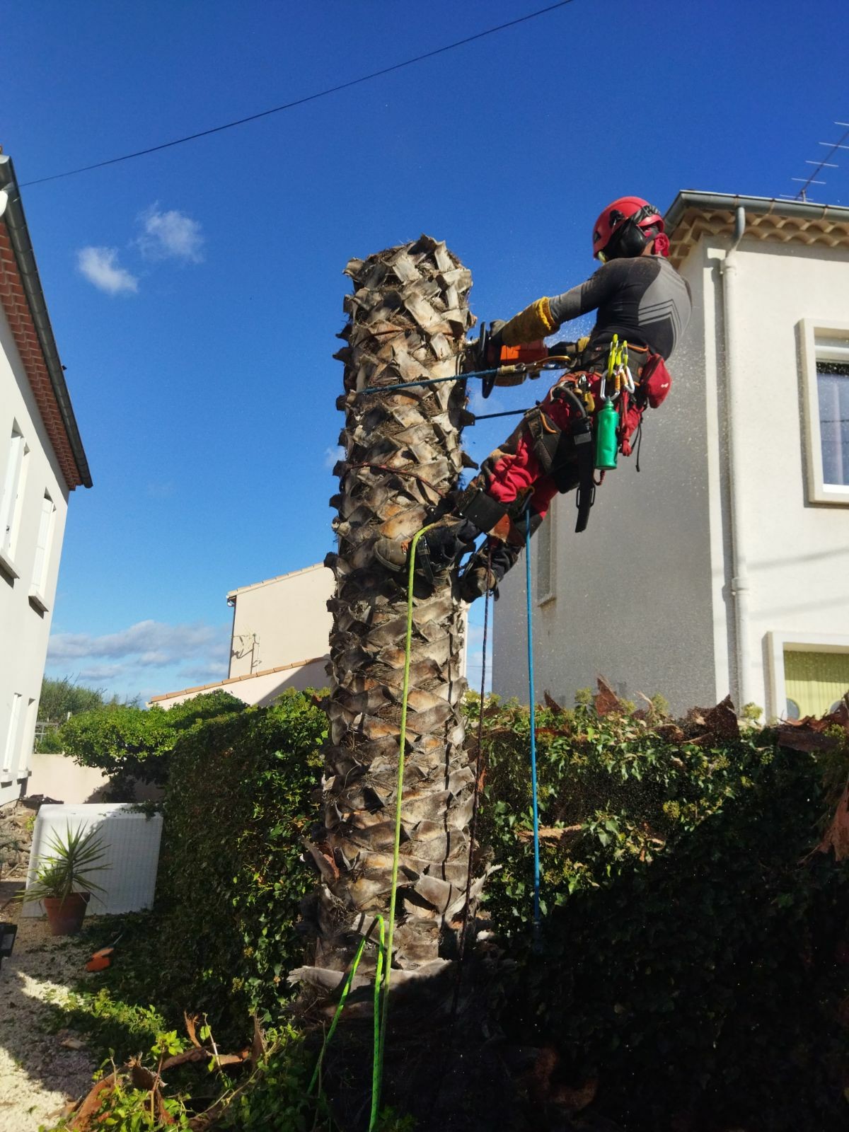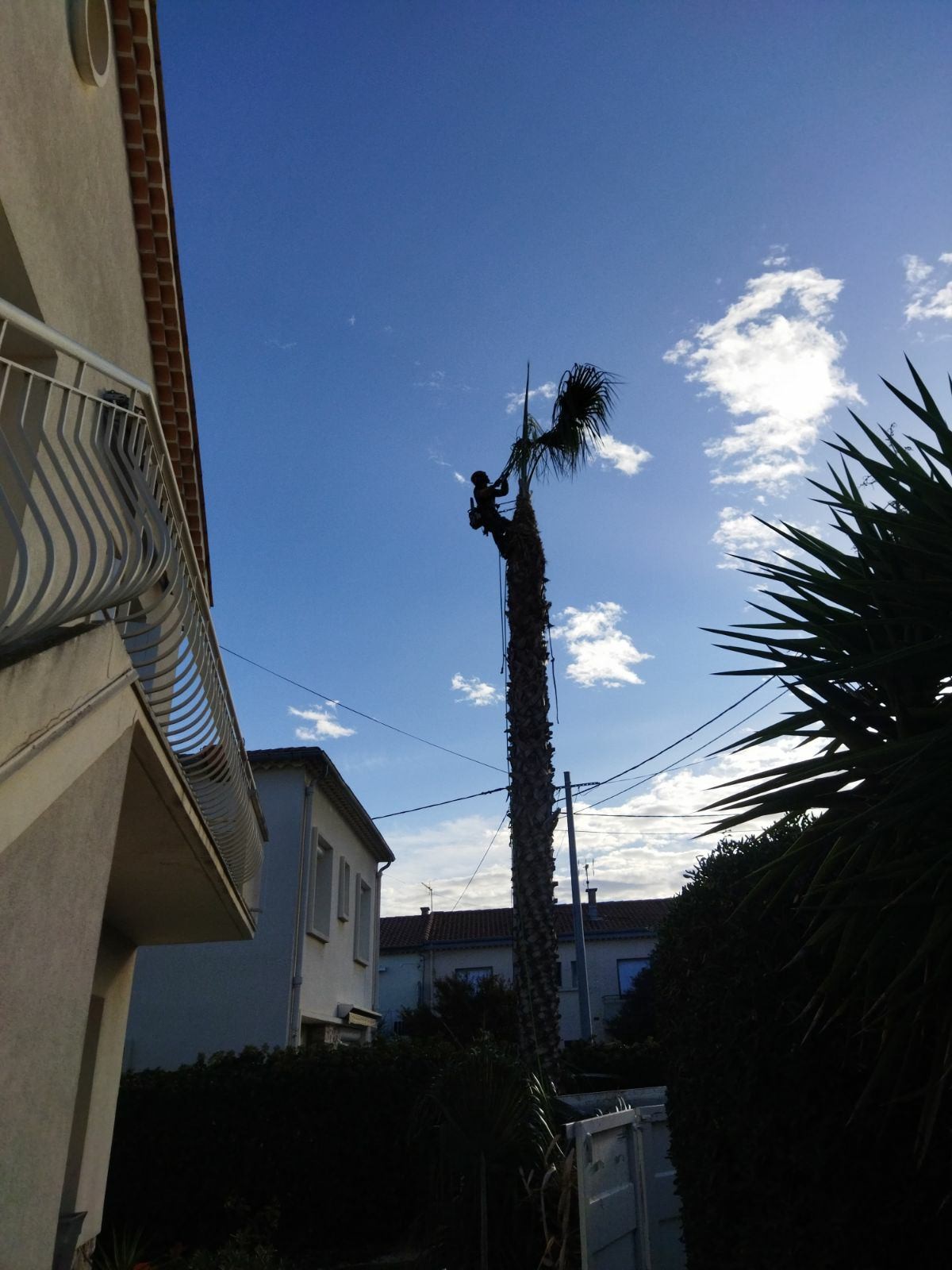 Suite à la demande du client j'ai procédé à un démontage d'un palmier de washingtonia de 12 m dans la commune de Béziers, ce procédé consiste à démonter le palmier petit à petit car dû aux contraintes et à une mauvaise position d'implantation il était impossible de réaliser un abattage . C'est démontage de palmier sont toujours délicats car la fibre du palmier est très compliqué à couper avec la tronçonneuse et comme le palmier est rempli d'eau son poids est très conséquent