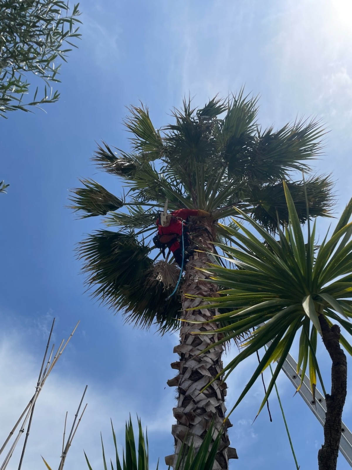 Aujourd'hui à colombiers (près de Béziers) j'ai réalisé comme chaque année un suivi d'entretien sur un palmier washingtonia. Je suis irrégulier permis d'enlever les palmes de l'année dernière qui sèche où se casse avec une suppression des fleurs de l'année qui entraîne pour vos jardins vous piscine des désagréments dû à la perte de la fleur qui salit ou bouche le système de filtration des piscines et quelques temps après le fruit en forme de billes de petite taille tombe ils sont très difficiles à enlever dans leur totalité. Bien sûr le côté esthétique n'est pas négligeable car votre palmier ne sera que plus beau et ne s'apportera pas plus mal, car avec un entretien régulier cela permet aussi d'éviter le risque de ponte des charançons rouges et du papillon et d'autant plus quand on a su une bonne formation spéciale sur les palmiers , quand on grimpe le palmier on peut voir si il y a une attaque des années précédentes enfin n'avertir notre client et de palier à une solution de traitement pour éviter de perdre le palmier
